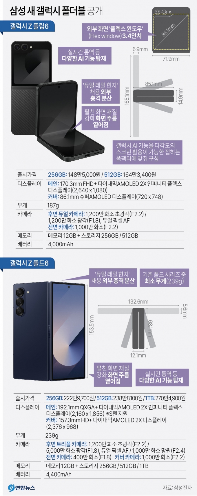 갤럭시Z 폴드6는 256GB, 512GB, 1TB 모델로 출시된다. 가격은 각각 222만9700원, 238만8100원, 270만4900원이다. 1TB 모델은 삼성닷컴, 이동통신사 홈페이지 등 주요 온라인 채널과 삼성스토어를 포함한 일부 오프라인 매장에서 만나볼 수 있다. 갤럭시Z 플립6는 256GB, 512GB로 출시되고, 가격은 각각 148만5000원, 164만3400원이다.