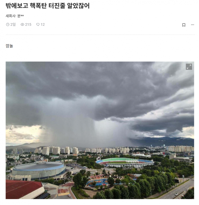 직장인 익명 커뮤니티 '블라인드'에 지난 11일 올라온 한 사진은 강원도 원주시 명륜동 원주종합운동장 건너편 지역에 폭우가 쏟아지는 모습이 담겨있다.