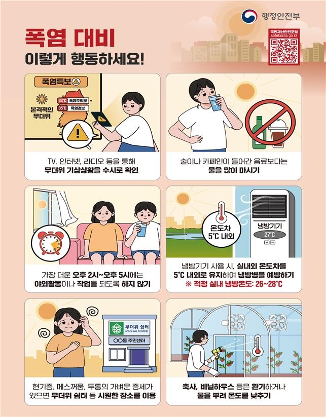 또 △냉방기 사용시 실내외 온도차를 5℃ 내외로 유지하도록 하고 △열질환 증세가 보이면 무더위 쉼터 등 시원한 장소로 이동해야 한다. 이외 △축사, 비닐하우스 등은 환기하거나 물을 뿌려 온도를 낮춰야 한다.