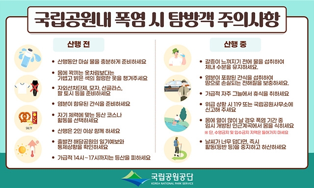 국립공원공단은 국립공원을 방문할 때 폭염에 의한 온열질환이 발생하지 않도록 하려면 통기성 있는 밝은색 계통의 헐렁한 옷을 착용할 것을 권고했다.
