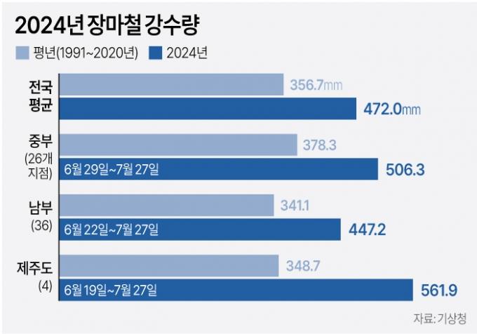 제주와 남부는 평년에 비해 장마기간이 길었다. 그만큼 비도 많이 내렸다. 기상청은 "중부와 남부, 제주는 평년의 1.3~1.6배 수준으로 비가 많이 내렸다"고 했다. 그러나 중부는 평년에 비해 장마기간이 3일 짧았지만 짧은 시간에 많은 비가 내려 피해가 속출했다.