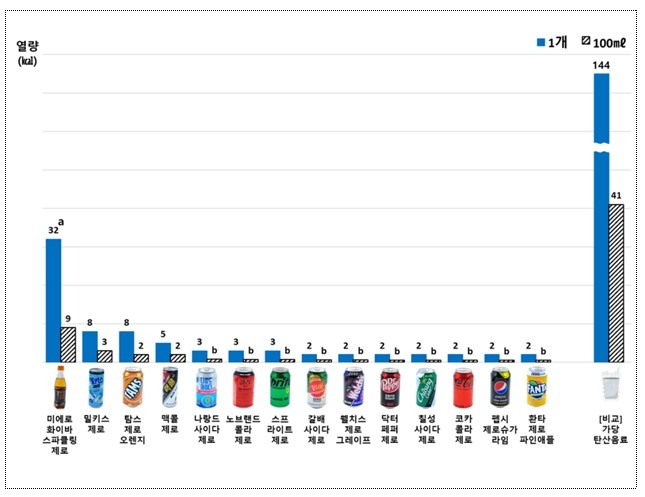 당류는 '밀키스 제로'가 100㎖당 0.4g, 나머지 13개에서는 검출되지 않았다. 열량은 시험대상 14개 제품 중 13개가 100㎖당 3㎉ 이하였고 '미에로화이바 스파클링 제로'가 100㎖당 9킬로칼로리(㎉)였는데 이는 식이섬유에서 기인한 열량(100㎖당 6㎉)을 포함하고 있었다. 제로음료 1개의 열량은 2~32㎉로 일반 가당 탄산음료(1개당 144㎉)와 비교시 1~22% 수준으로 적은 편이었다.