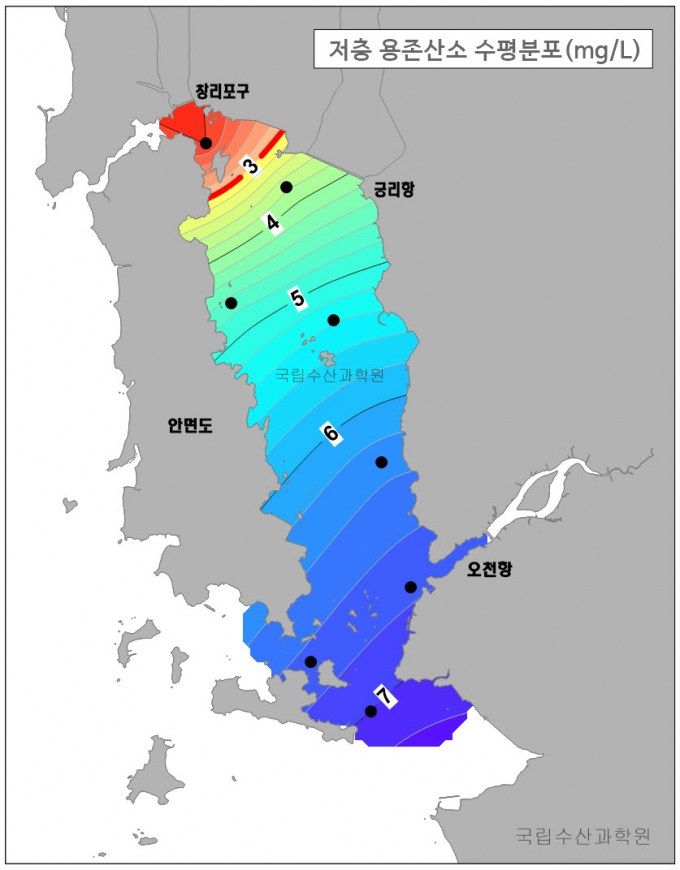 해양수산부 국립수산과학원이 6일 서해안 천수만에서 산소부족 물덩어리(빈산소수괴)가 관측돼 수산 양식생물 피해가 우려된다고 밝혔다.