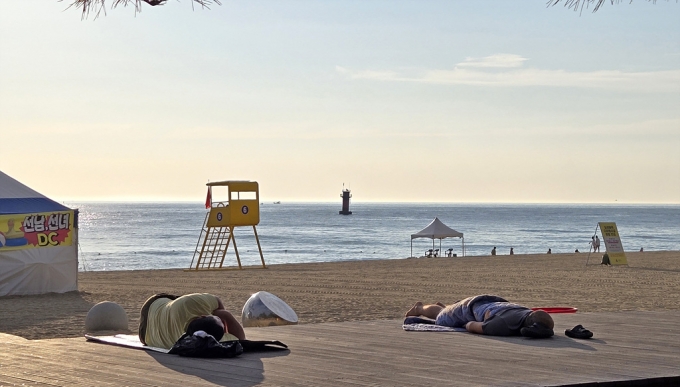 ▲지난 7일 오전 강원 강릉시 경포해변에서 열대야를 피해 나온 주민들이 잠을 자는 모습 (사진=연합뉴스)