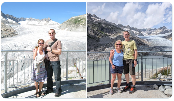 지난 4일(현지시간) 영국 브리스톨 출신의 소프트웨어 개발자 던컨 포터 씨는 2009년 8월과 2024년 8월 스위스 알프스 론 빙하에서 아내와 함께 찍은 사진을 소셜미디어 플랫폼 X(옛 트위터)에 나란히 게시했다.