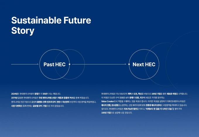 창립 50주년 스페셜 섹션인 'Sustainable Future Story'에서 현대엔지니어링은 급변하는 산업 패러다임에 발맞춰 지속가능한 발전을 이루고 인류와 사회, 지구를 위한 미래를 창조해 나가겠다는 의지를 밝혔다.