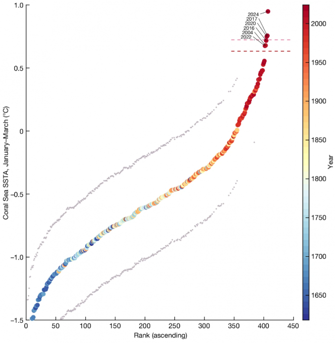 연구팀은 대보초 산호의 골격 표본을 채취해 화학적 구성 변화를 토대로 1618~1995년 대보초 해역의 수온 변화를 측정했다. 산호는 환경조건만 맞으면 수백년을 넘게 살 정도로 수명이 길다. 이 데이터에 1900~2024년 인간이 직접 해수온도 측정기기를 활용해 얻어낸 수온기록을 결합했다. 이를 기반으로 산호가 수온상승으로 하얗게 변하는 백화현상이 주로 발생하는 1~3월의 온도 추이를 분석한 것이다.