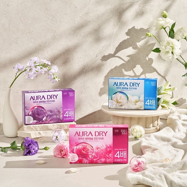 아우라 생화캡슐 드라이시트는 △피오니 로즈 △프레시 릴리 △자스민 머스크 3가지 향으로 출시됐다. 대형마트와 온라인 스토어 등에서 구매할 수 있다. LG생활건강 관계자는 "온라인 고객 리뷰에 '건조기 사용 후에도 향기가 그대로 남아 좋았다'는 의견이 많이 남았다"면서 "향기의 오랜 지속력과 더불어 옷감의 손상을 줄이는 등 빨래의 품질을 개선해서 차별적인 고객경험을 누릴 수 있도록 준비한 제품"이라고 강조했다.