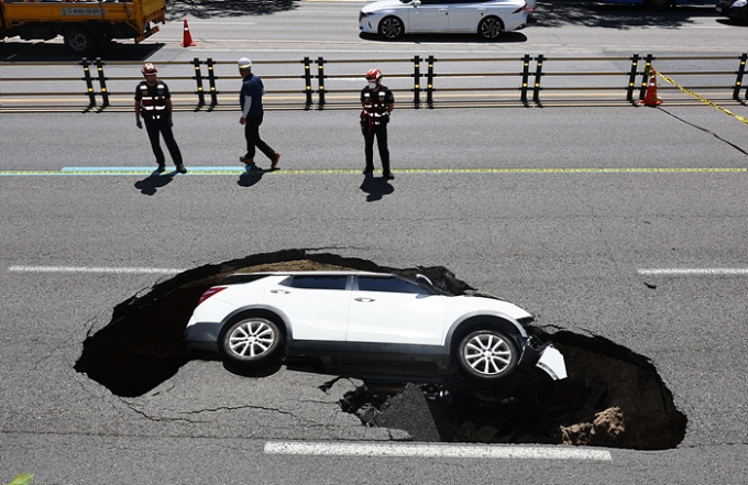 도로를 달리던 승용차가 땅속으로 꺼지는 사건이 서울 한복판에서 발생했다.