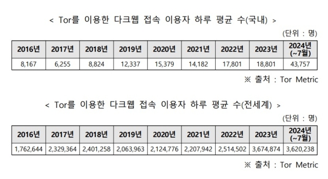 국회 과학기술정보방송통신위원회 소속 국민의힘 박충권 의원이 한국인터넷진흥원(KISA)으로부터 제출받아 30일 공개한 자료에 따르면 올들어 대표적인 다크웹 접속 프로그램 '토르'의 국내 이용자가 하루평균 4만3757명인 것으로 나타났다. 지난해 국내 일평균 이용자가 1만8801명이었는데 그 사이에 2배 이상 늘었다.