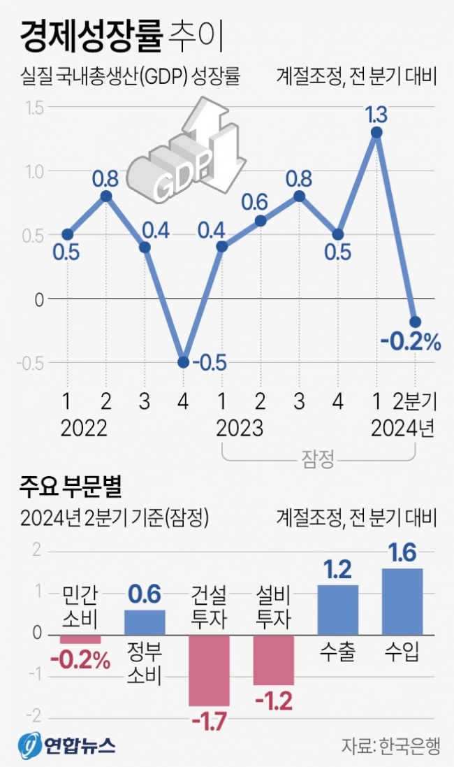 한국은행은 올 2분기 실질 국내총생산(GDP) 성장률 잠정치가 직전분기대비 -0.2%로 집계됐다고 5일 발표했다. 지난해부터 올 1분기까지 5분기 연속 성장기조가 1년 6개월만에 깨졌다. 2022년 4분기 성장률은 -0.5%이었다.
