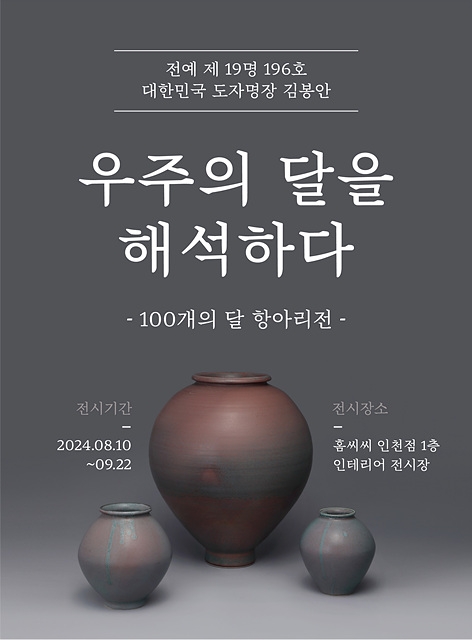 '우주의 달을 해석하다-100개의 달항아리 전'이라는 주제로 열리는 이번 전시에서는 전통 청자의 장인으로 손꼽히는 김 명장이 우주의 기운을 담은 달과 인류 문명의 상징인 항아리의 관계성을 독창적인 예술관으로 풀어낸 달항아리 작품 100점이 전시된다.
