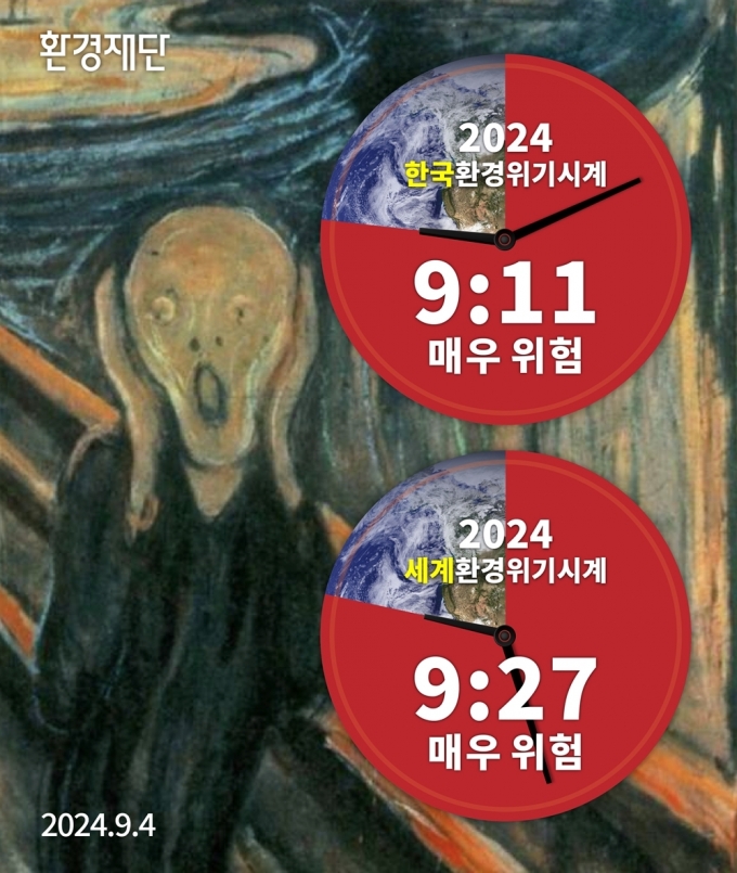 전세계 128개국 2093명의 환경·지속발전가능·ESG 관련 전문가와 시민사회 단체 활동가를 대상으로 설문조사한 내용을 토대로 분석한 결과, 세계 환경위기시계는 지난해보다 4분 줄어든 9시 27분이고, 한국 환경위기시계는 지난해 9시28분보다 17분 앞당겨진 것으로 나타났다.