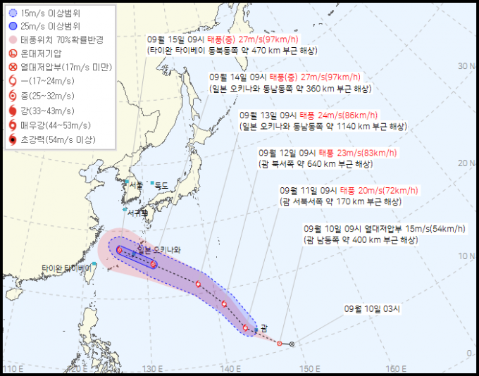 한반도를 뒤덮고 있는 고기압 때문에 추석을 코앞에 두고도 무더위가 이어지고 있지만, 이 고기압이 한반도로 태풍이 접근하지 못하도록 막아주는 방패막이 역할도 하고 있다.