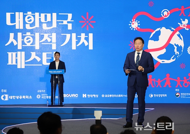 최태원 대한상의 회장은 12일 서울 강남구 코엑스에서 열린 '제1회 대한민국 사회적 가치 페스타' 개회사에서 "기후위기, 저출생, 지역소멸 등 난제들은 그대로 두면 지역 문제를 넘어 인류 생존문제로 이어진다"며 "각개격파하기엔 변화의 속도가 너무 빨라 1석2조가 아닌 돌 하나로 10마리의 새를 잡는 1석多조의 아이디어가 필요하다"고 밝혔다.