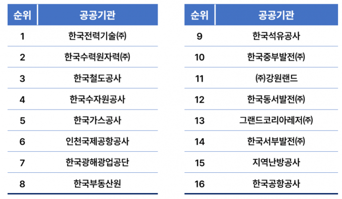 그 결과, 한국전력기술이 1위, 한국수력원자력이 2위, 한국철도공사가 3위로 랭크됐다. 그 다음으로 한국수자원공사와 한국가스공사, 인천국제공항공사, 한국광해광업공단, 한국부동산원, 한국석유공사, 한국중부발전 등이 순위를 이었다. 순위는 평가대상 32개 가운데 16개만 공개됐다.