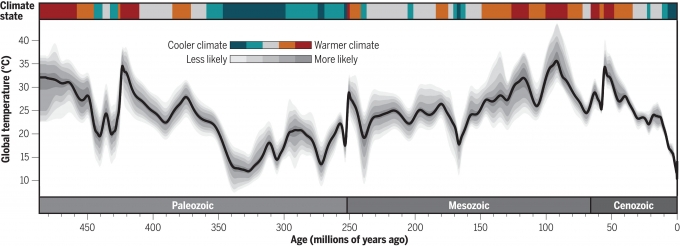 20일(현지시간) 미국 애리조나대학·스미스소니언 국립자연사박물관 에밀리 저드 박사는 온도변화를 추정할 수 있는 지질학적 데이터와 기후모델 시뮬레이션을 통합해 5억4000만년간의 현생대 가운데 4억8500만년 기간의 지구평균 표면온도(GMST)를 재구성한 결과(PhandDA)를 '사이언스'(Science)에 게재했다.