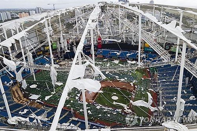 서부 해안도시 세인트피터즈버그에 위치한 미국 프로야구(MLB) 경기장인 트로피카나 필드도 폭우와 강풍으로 지붕이 뜯겨져 넝마가 됐다. 경기장 내부의 피해 상황은 아직 확인되지 않고 있지만 크레인도 여러 대 쓰러진 것으로 전해진다.