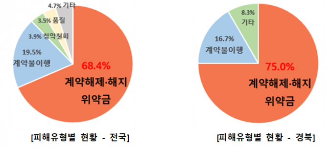경북지역 역시 '계약해제·해지 거부 및 위약금' 관련 내용이 36건(75.0%)으로 가장 큰 비중을 차지했다.