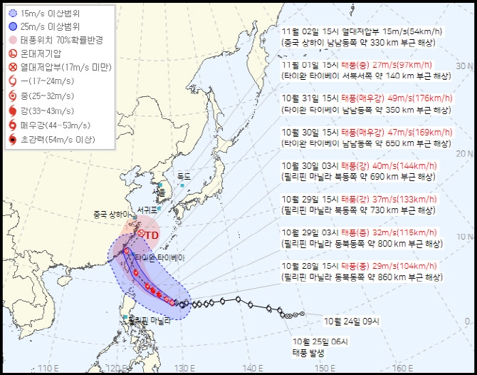다만 태풍의 예상 진로는 아직까지 유동적이다. 대만의 높은 산들에 부딪혀 태풍이 약화할 수 있고, 한반도 방향으로 전향할 가능성도 완전히 배제할 수도는 없다. 콩레이의 한반도 영향 가능성은 30일쯤 판가름 날 전망이다. 만약 '콩레이'가 한반도로 향한다면 우리나라는 47년만에 11월 태풍이 상륙하는 것이다.