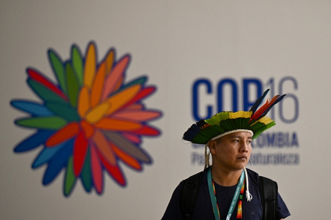 ▲콜롬비아 칼리 COP16 회담장 앞에 서있는 브라질 원주민 남성의 모습 (사진=AFP/연합뉴스)