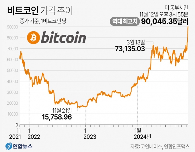 비트코인이 12일(현지시간) 사상 최초로 9만달러를 돌파했다.