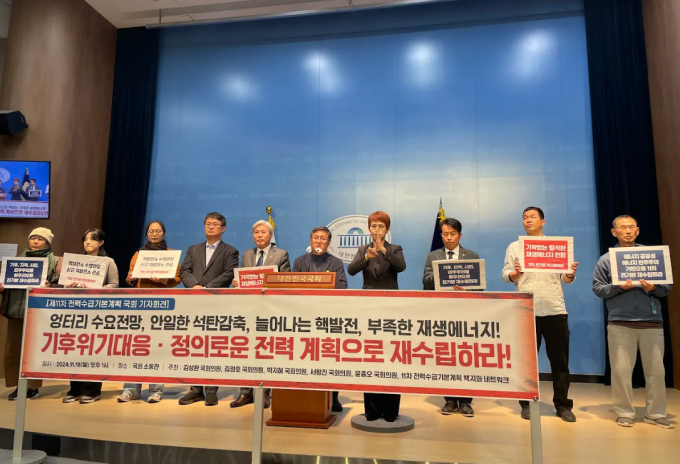 18일 서울 여의도 국회소통관에서 시민사회 연대체 '11차 전력수급기본계획 백지화 네트워크'와 더불어민주당 김성환·김정호·박지혜 국회의원, 조국혁신당 서왕진 국회의원, 진보당 윤종오 국회의원은 11차 전기본 정부안이 △엉터리 수요전망 △안일한 석탄감축 △부족한 재생에너지 △늘어나는 핵발전 등의 문제로 기후위기 대응에 적절치 않다며 재수립을 촉구하는 기자회견을 열었다.