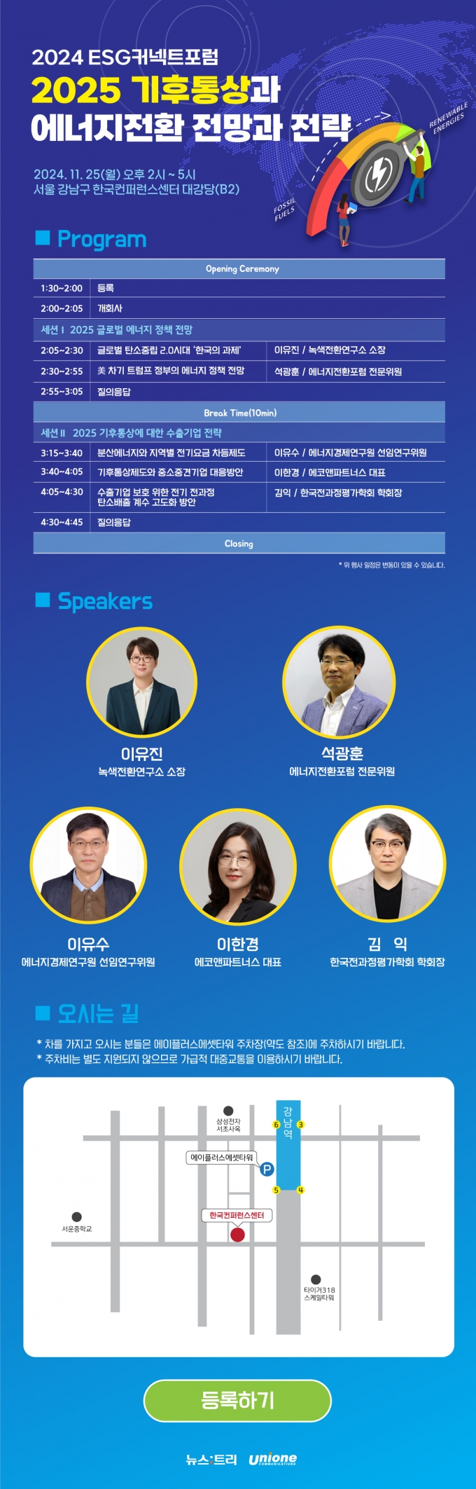 이에 뉴스트리는 '2025 기후통상과 에너지전환 전망과 전략'을 주제로 25일 개최하는 '2024 ESG커넥트포럼'에서 우리 수출기업이 나아갈 방향을 짚어보고자 합니다. 아울러 도널드 트럼프가 미국 차기 대통령에 당선됨에 따라 미국 에너지 정책이 어떤 방향으로 전환될 것인지에 대해서도 전망해보고자 합니다.