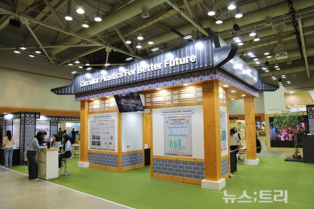 전시장 입구에 들어서면 가장 먼저 '한국의 미'를 콘셉트로 한 기와집 모양의 전시부스가 눈길을 끌었다. 이곳에서는 페트병, 플라스틱용기, 비닐류, 발포합성수지 등 플라스틱 폐기물 품목별 분리배출하는 방법부터 회수해 선별하는 과정이 설명돼 있었다. 우리나라가 일찍이 시작했던 분리수거 과정을 상세히 담았다.