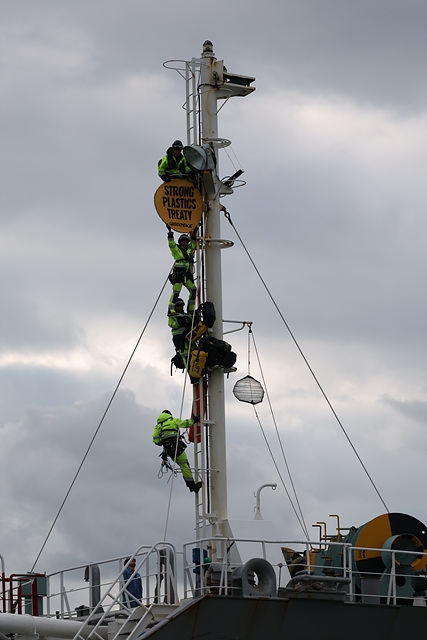 국제 플라스틱 협약이 진전을 보이고 있지 않자 환경운동가들이 유조선 돛대에 올라 플라스틱 생산감축을 촉구하는 시위를 벌였다.