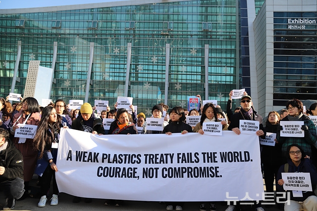 부산 벡스코에서 열리고 있는 '국제 플라스틱 협약' 5차 협상위(INC-5)에서 그동안 별다른 입장 표명이 없던 한국이 '생산감축을 협약에 포함시키자'는 성명에 동참했다.