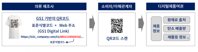 현재 식별체계 가운데 가장 유력하게 거론되는 것은 GS1 기반의 QR코드다. 이는 △기존 바코드 기능을 포함해 매장에서 결제 및 재고 관리에 동일하게 활용이 가능하고 △국제적으로 호환이 되며 △웹 기반으로 소비자나 이해관계자가 원재료 출처, 탄소배출량, 재활용 정보 등 다양한 제품 정보에 쉽게 접근할 수 있다.
