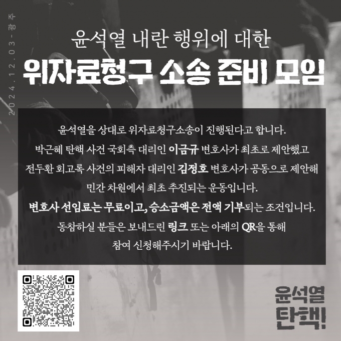 '12·3 비상계엄 사태'로 불안·공포감을 느낀 국민들이 윤석열 대통령을 상대로 정신적 피해보상을 요구하는 위자료 청구소송이 추진된다.