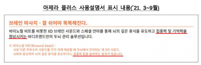 바디프랜드는 지난 2021년 3∼9월 자사의 '아제라 플러스' 제품 사용설명서에 '브레인 마사지 프로그램'이 집중력 및 기억력 향상을 시킨다거나 집중력 등을 높여주는 효과가 있다고 표시했다.