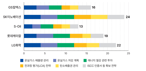 가장 높은 점수를 받은 SK이노베이션은 탄소배출권 확보와 온실가스 배출량 관리 즉 스코프3 배출량 관리에서 상대적으로 높은 평가를 받았지만, 전반적인 온실가스 감축에 대한 실행 및 대응 전략이 미흡하며 국제기준에 비하면 상당히 뒤쳐지는 상황이다. 2위를 차지한 LG화학도 스코프3 배출량 관리와 ISCC 인증서 등 확보 전략에서 높은 점수를 받았지만 전과정평가(LCA)와 공급망 전반에 대한 구체적 관리 전략이 미흡했다. 롯데케미칼과 GS칼텍스는 온실가스 관리 시스템을 갖추고 있음에도 불구하고 에너지 전환 투자와 스코프3 관리전략이 미흡했다. 에스오일의 경우 감축 계획이 매우 제한적이며, 스코프3 산정과 전과정평가 전략이 부재한 것으로 나타났다.