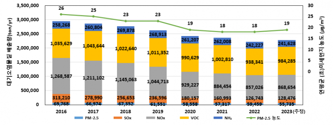 황산화물(SOx)은 3만4000톤(21.3%), 질소산화물(NOx)은 2만7000톤(3.1%), 휘발성유기화합물(VOCs)은 6만4000톤(6.4%), 암모니아(NH3)는 2만톤(7.5%) 감소했다. 이런 감소 추세는 2016년부터 6년간 계속 이어지고 있다.