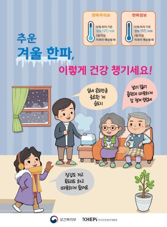 강추위가 이어짐에 따라 노인층이나 기저질환자 등 건강 취약계층 피해를 예방하기 위한 조치가 필요하다. 이에 한국건강증진개발원(KHEPI)은 한파 대비 건강관리 안내자료를 전국 시·도 및 보건소에 배포했다.