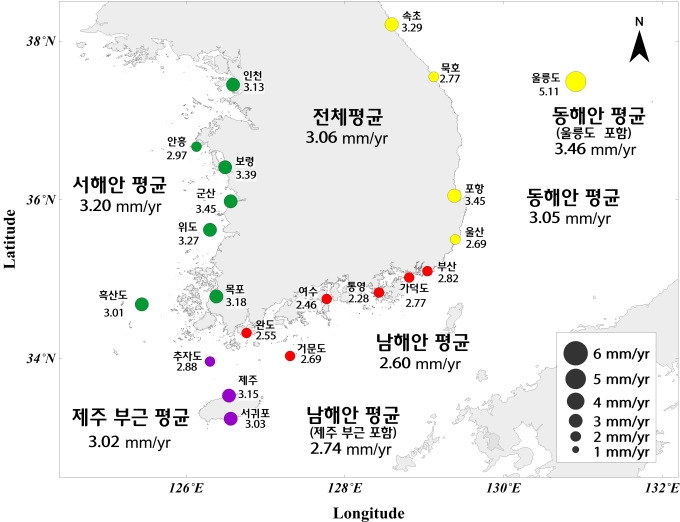 1989년~2023년까지 35년간 해역별 평균 해수면 상승은 동해안이 12.1㎝로 가장 높았고, 다음으로 서해안 11.2㎝, 남해안 9.6㎝ 순으로 나타났다. 관측지점 중에는 울릉도가 17.9㎝로 가장 크게 상승했다.
