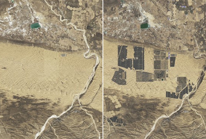 공개된 사진을 보면 8년전만 해도 황량한 모래벌판이었던 곳이 우주에서 식별이 가능할 정도로 거대한 태양광 발전단지로 탈바꿈했다. 위성 이미지를 분석한 결과, 쿠부치 사막의 태양광 발전 면적은 137.21평방킬로미터(㎢)에 달했다. 서울 면적의 4분의 1이다.