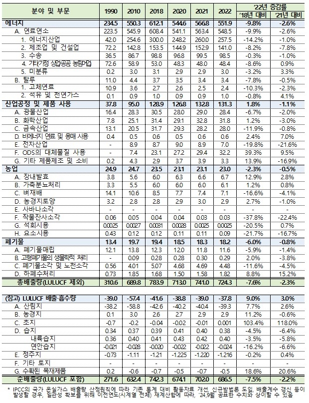 2022년도 국가온실가스 배출량은 에너지·산업공정·농업·폐기물 등 전 분야에 걸쳐 전년보다 감소한 것으로 나왔다. 에너지 부문이 2.6%로 가장 많이 감소했고, 산업공정·제품사용 부문은 1.1% 줄었다. 또 농업 부문 배출량은 0.5%, 폐기물은 0.8% 감소했다.