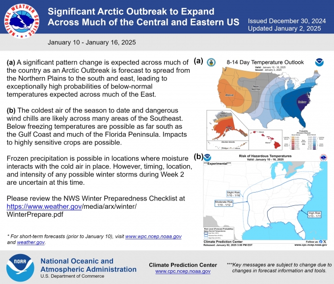 NWS 예보에 따르면 오는 10일 로키산맥 동쪽의 노던 플레인스 지역부터 한파 영향이 시작되면서 미국 중서부, 남부, 동부 등 대부분 지역에 영향을 미칠 것으로 보인다. 특히 플로리다를 포함한 미국 남동부는 올겨울들어 가장 심한 한파가 닥칠 것으로 전망되며, 최남부인 플로리다 반도에서도 기온이 영하까지 떨어지는 지역이 많을 것으로 예보됐다.