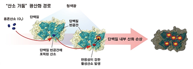 반면 연구팀이 밝혀낸 단백질 손상 경로는 항산화 시스템이 닿지 않는 단백질 내부에서 일어난다. 단백질 내부에 갇힌 산소가 특정 아미노산과 상호작용하며 청색광의 에너지를 흡수하고, 이를 통해 활성산소로 바뀌는 경로다. 생성된 활성산소는 단백질 내부를 돌아다니며 궁극적으로 단백질 손상을 유발한다.