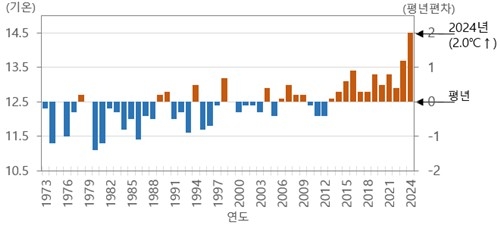 9일 기상청은 지난해 연평균 기온이 평년(1991∼2020년 평균) 연평균 기온 12.5℃보다 2℃ 높은 14.5℃로 가장 높았다고 밝혔다. 기상관측망이 전국에 확충된 1973년부터 따지면 52년 이래 가장 높았다. 지난 2023년에도 연평균 기온 13.7℃로 '가장 더운 해'로 기록됐는데 이 신기록을 1년만에 갈아치운 것이다.