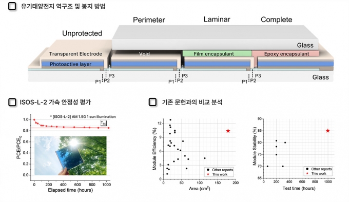 대면적 모듈 크기를 온전히 보호하는 새로운 방법도 도입했다. 이를 바탕으로 세계 최고 수준인 206cm² 크기의 대면적 반투명 유기태양전지 모듈에서 1000시간 이상의 가속 열화 조건의 고안정성 테스트도 통과했다. 이것은 기존 문헌에 보고된 최고 수준인 114.5cm²면적에서 4.5%의 광전변환효율과 비교했을 때 면적이 약 1.8배 확장됨에 동시에 2.3배 높은 광전변환 효율을 달성한 것이다.