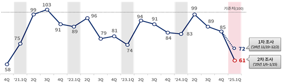 대한상공회의소가 전국 제조기업을 대상으로 '2025년 1분기 기업경기전망지수(BSI)'를 조사한 결과, 직전 분기 85보다 24포인트(p) 하락한 '61'로 집계됐다. 이는 지난해 1분기 83에 비해 22p 하락한 것이다. BSI는 100이상이면 해당 분기의 경기를 이전 분기보다 긍정적으로 본 기업이 많다는 의미이고, 100이하면 그 반대다.