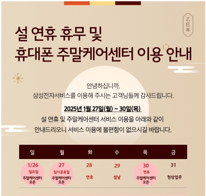 26일과 27일 그리고 30일은 '주말 케어센터' 9곳에서 사전예약을 통해 휴대폰, 태블릿, 웨어러블 수리서비스를 이용할 수 있다. 설 전날인 28일과 설날인 29일은 서비스센터를 운영하지 않는다.