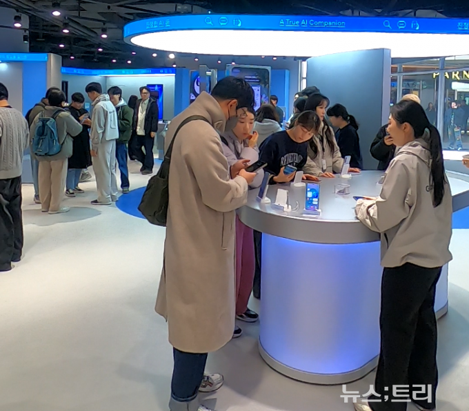 코엑스점 '갤럭시 스튜디오'에 들어서니 학교 강의실처럼 꾸며져 있었다. 갤럭시S25 기본모델과 플러스, 울트라 기종을 한꺼번에 비교할 수 있도록 전시돼 있었고, 갤럭시S25에 새로 추가된 AI 기능 '나우 브리프'나 AI 카메라 기능 '포토 어시스트' 등도 직접 체험해볼 수 있도록 해놨다. 방문자들은 저마다 전시된 신제품을 들고 음성명령나 AI 기능을 테스트하는 모습을 보였다.