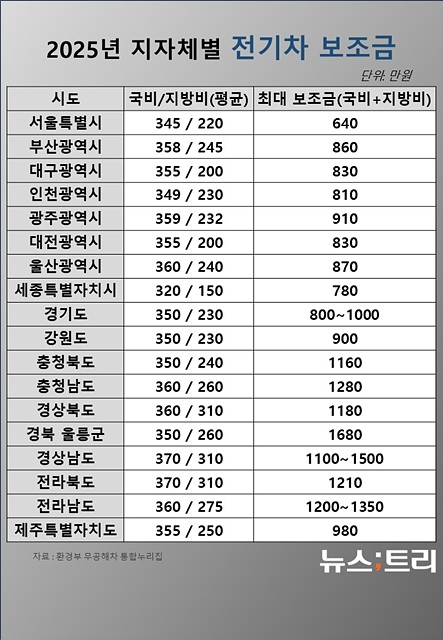 올해 전기자동차 보조금 지급액수가 가장 많은 지방자치단체는 최대 1680만원을 지급하는 경상북도 울릉군이고, 가장 작은 지자체는 580만원을 지급하는 전남 영암군으로 나타났다. 지역에 따라 보조금 액수가 1100만원까지 차이가 난다.