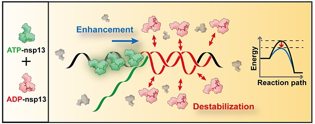 연구팀은 nsp13 헬리케이스가 ATP(아데노신 삼인산)를 분해하여 나온 화학에너지를 이용하여 유전물질인 RNA의 꼬인 구조를 단일 가닥으로 풀어주고 부산물로 ADP(아데노신 이인산)가 생성하고 이때 생성된 ADP가 nsp13와 재결합하게 되면 샤페론 기능을 활성화시켜 RNA 이차구조를 추가로 불안정화한다는 사실을 알아냈다.