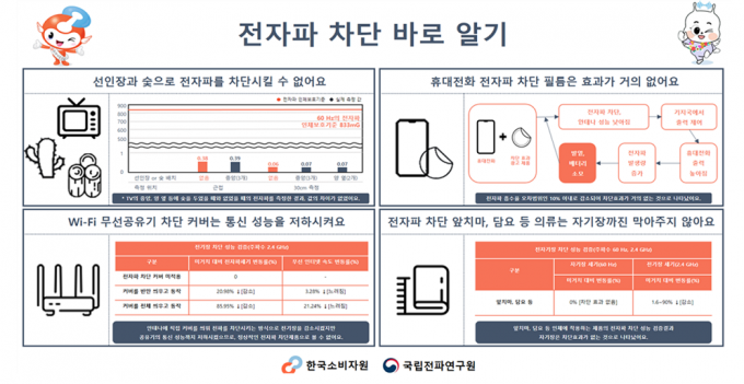 한국소비자원과 국립전파연구원이 시중에 유통중인 전자파 차단제품 4개에 대해 성능을 확인하는 한편 국민이 요청한 19개 전기·전자 제품의 전자파 발생량을 시험평가한 결과, 전자파 차단제품 4개는 모두 차단 효과가 미미했고 19개 전기·전자 제품의 전자파 발생량은 인체보호기준 대비 20% 이내로 안전한 수준이었다고 27일 밝혔다.
